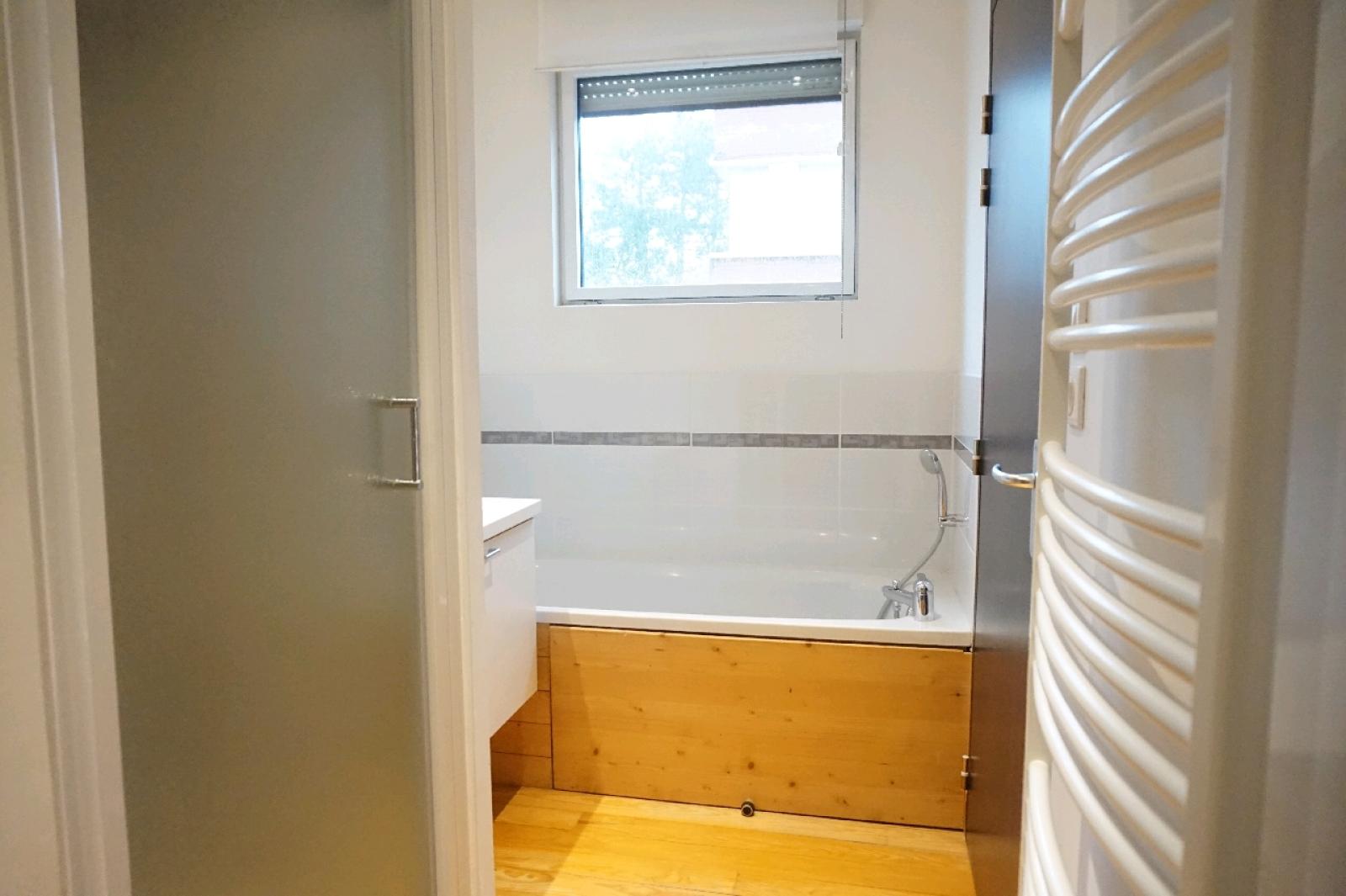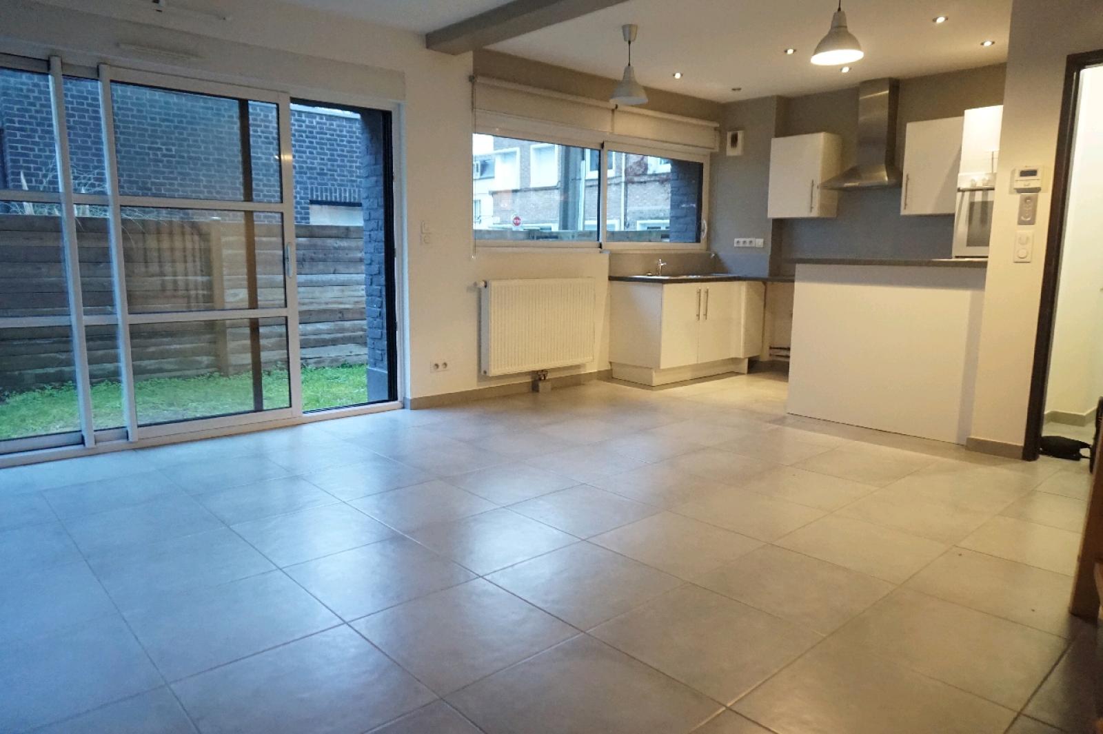 Maison T3 de 62 m² située Rue de Lisieux à Lambersart. Le logement comprend une entrée, un séjour carrelé, une cuisine américaine équipée (plaques, four, hotte, réfrigérateur, rangements, arrivée d'eau MAL ou LV), deux chambres parquetées, une salle de bain (baignoire, douche, meuble vasque, sèche-serviette) et WC séparés.