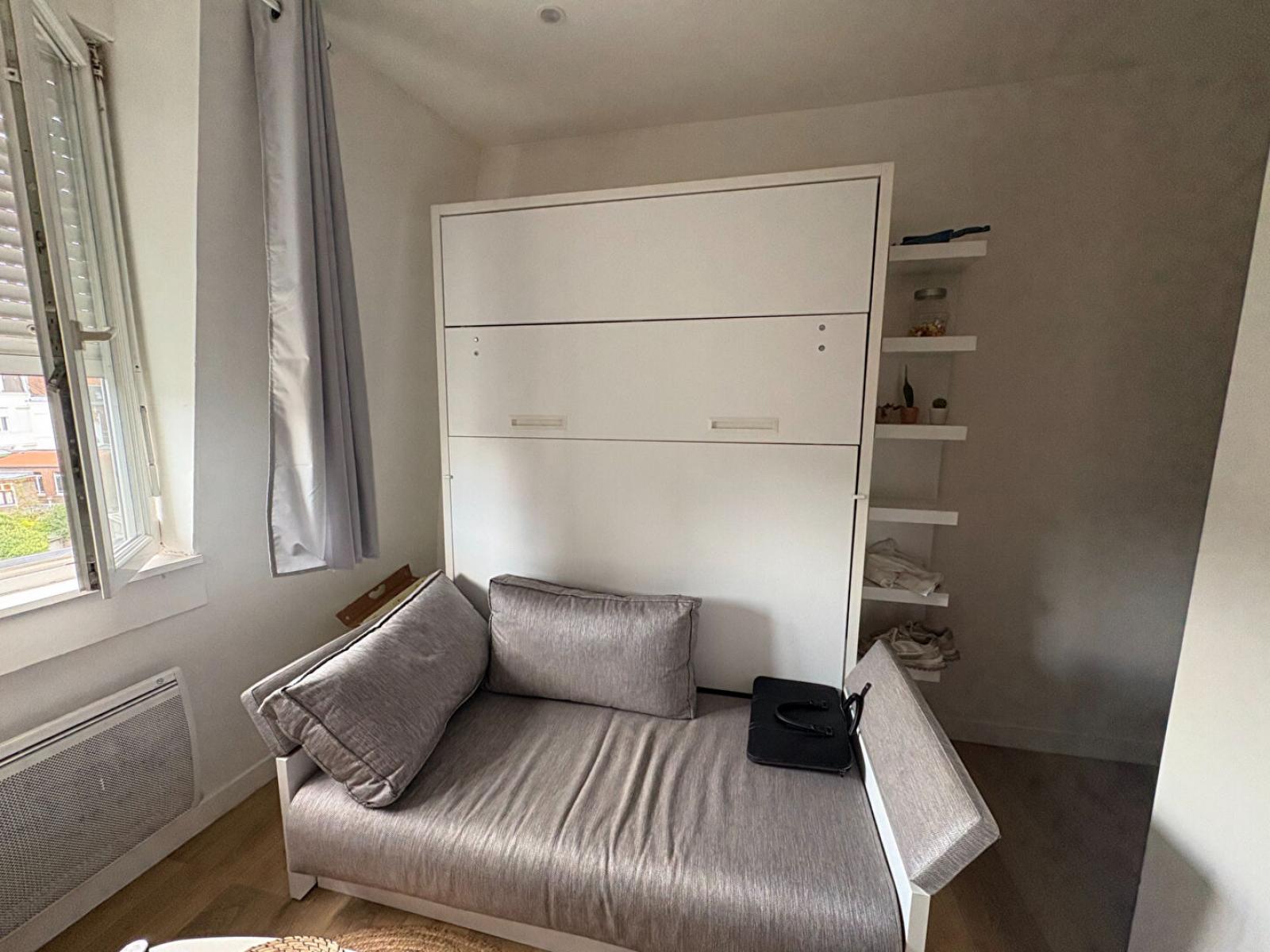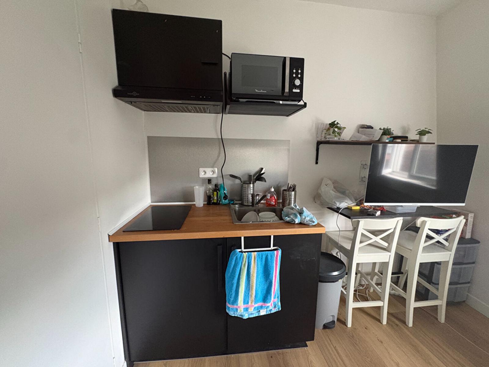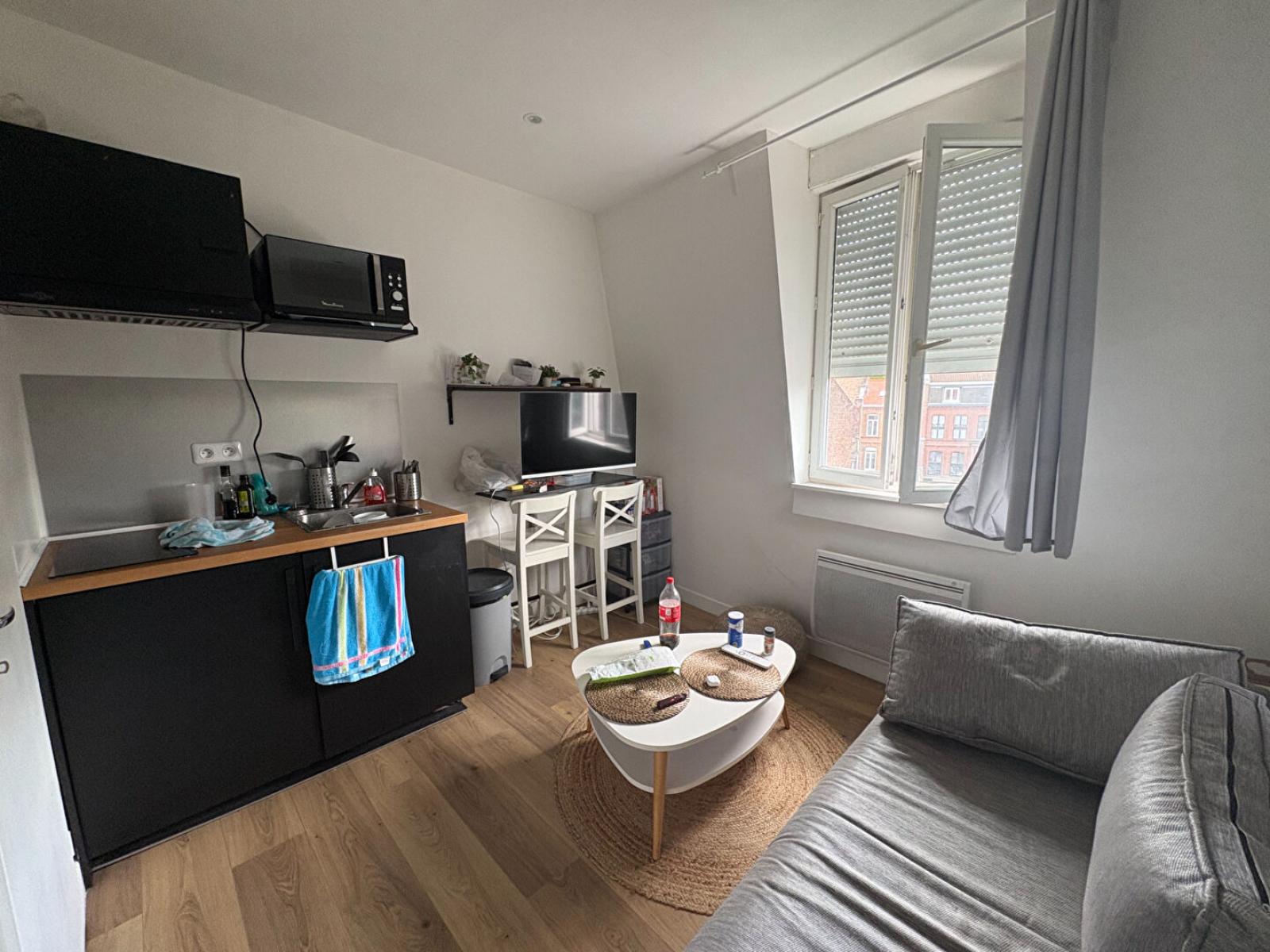 Studio MEUBLÉ de 15m2 au troisième étage, situé rue de la Bassée à Lille. L'appartement comprend une pièce à vivre (canapé, lit escamotable, table, meuble de rangement), une cuisine ouverte (frigo, plaques de cuisson, évier, hotte, rangements et ustensiles de cuisine), une salle de douche et WC séparés.
