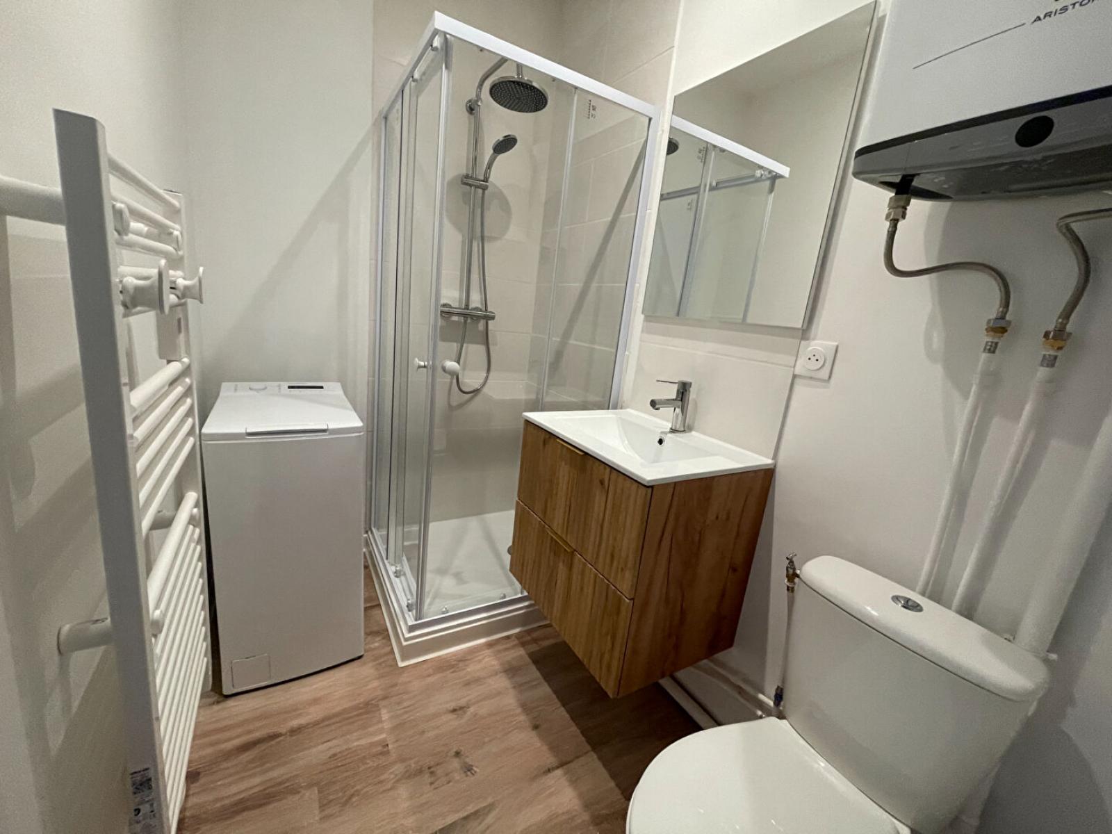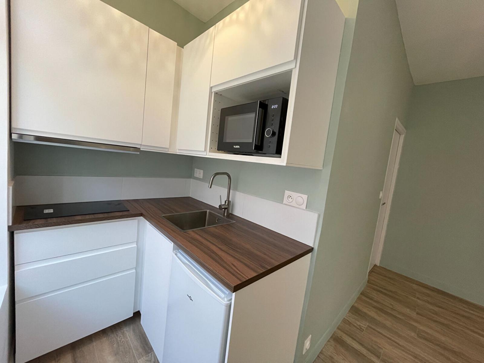 Studio rénové de 23 m² situé au premier étage sur rue. L'appartement comprend une entrée, une pièce à vivre avec un coin cuisine équipée (réfrigérateur, plaques, hotte, micro-ondes, rangements) ainsi qu'une salle d'eau (douche, meuble vasque, sèche serviette, machine à laver, WC).