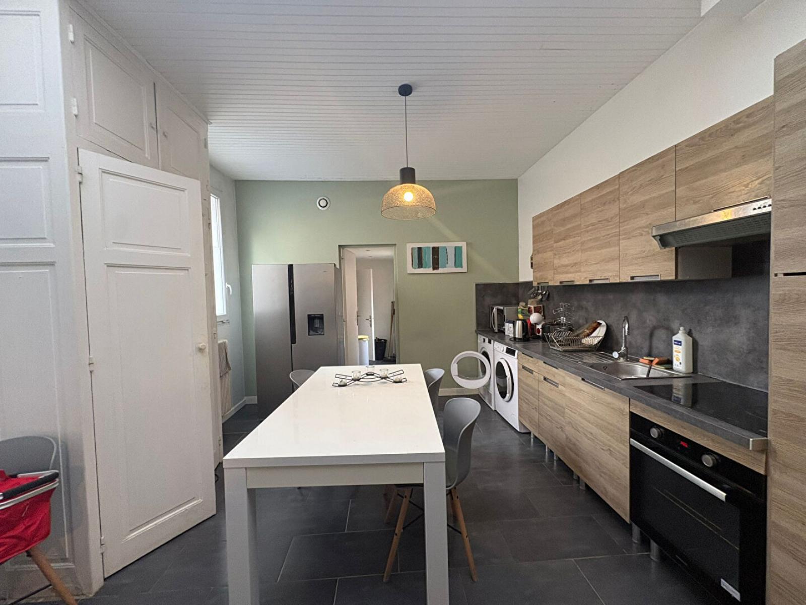 Au RDC de la maison un séjour, une cuisine toute équipée (frigos, congélateur, four, plaque, hotte et machine à laver).
