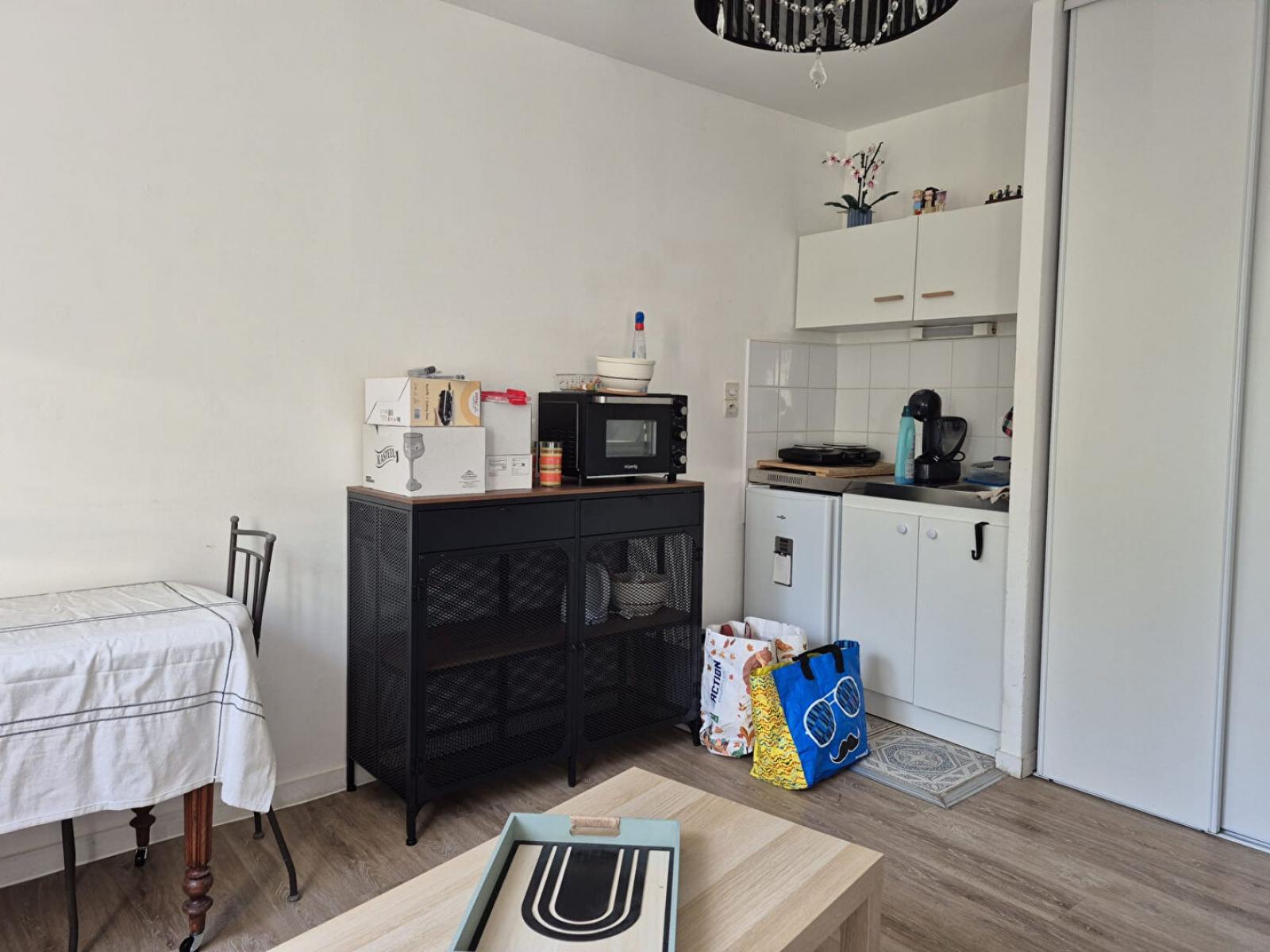T1 NON MEUBLÉ de 18.80 m², situé au RDC. L'appartement comprend un séjour, une kitchenette semi-équipée (réfrigérateur, plaques) et une salle d'eau ( douche, vasque et WC)