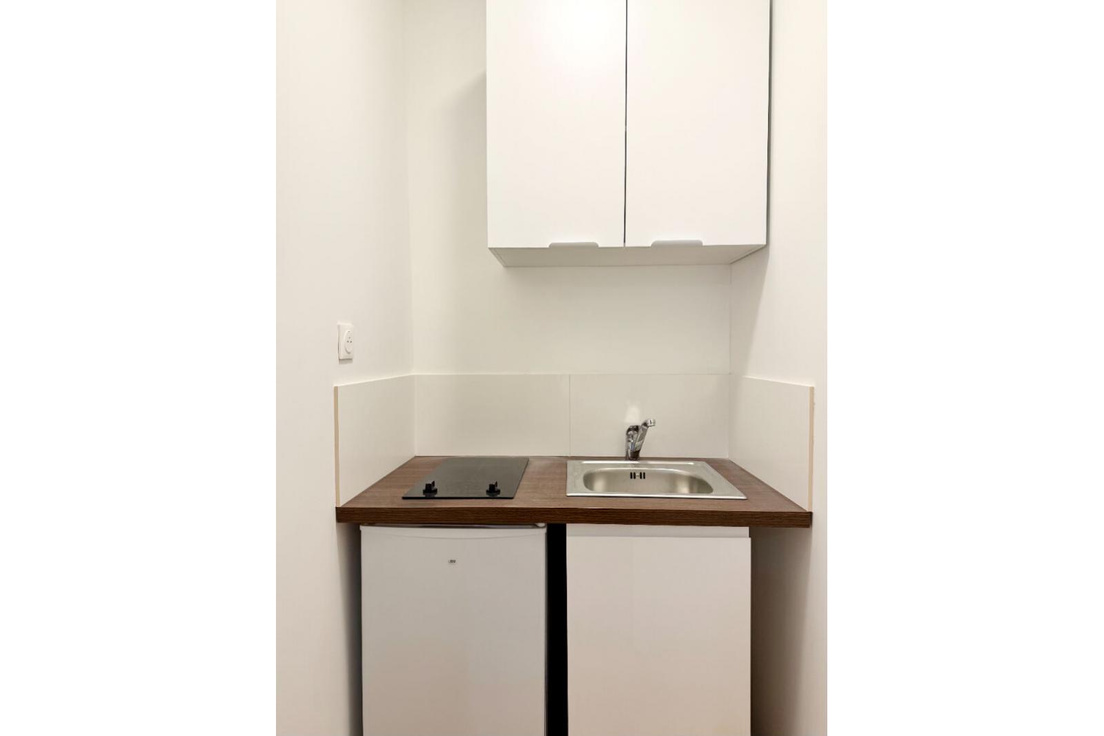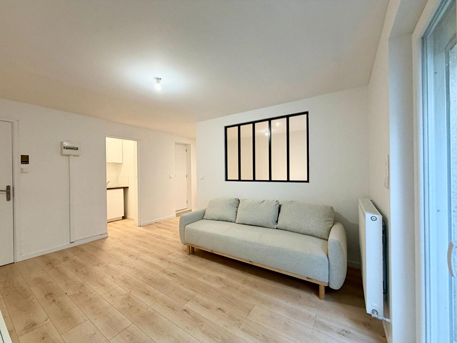 T1 bis avec mise à disposition du mobilier et entièrement rénové de 30.32 m² situé au RDC en fond de cour. L'appartement comprend une entrée, une pièce (canapé) à vivre avec un coin cuisine équipée (réfrigérateur, plaques, rangements) ainsi qu'une chambre et une salle d'eau (douche, meuble vasque, sèche serviette, WC).