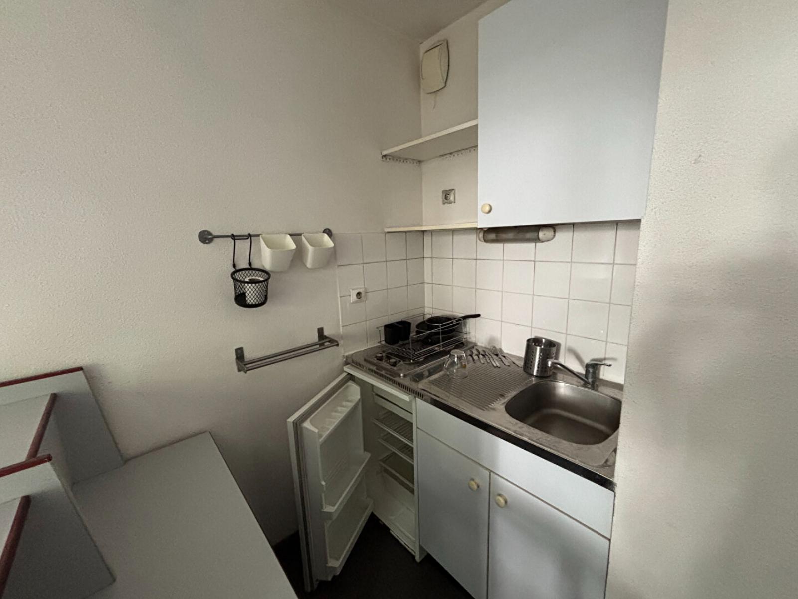 Studio MEUBLÉ de 18.57 m² au 1er étage d'une résidence calme et sécurisée, comprenant une entrée avec placard aménagé, un séjour (lit une place, bureau et chaise), une cuisine ouverte (plaque, frigo), une SDB (baignoire, vasque, miroir, WC).