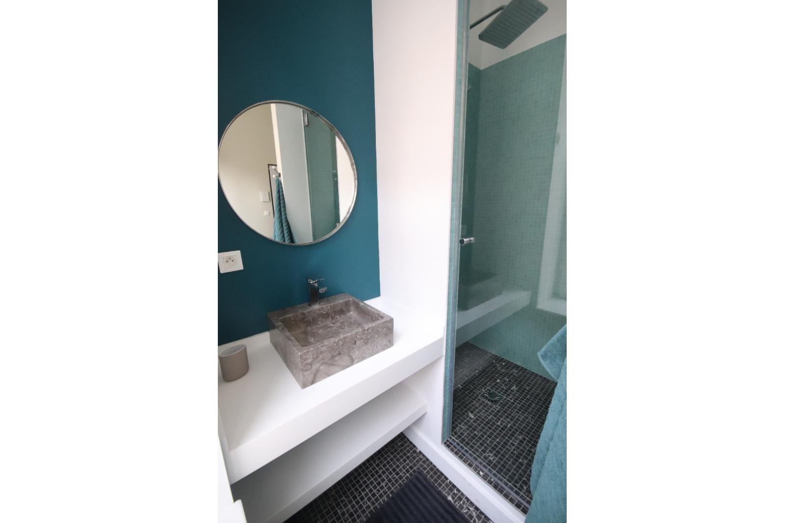 Il comprend une pièce à vivre avec lit double, rangements et coin bureau, une salle de douche (douche, meuble vasque et wc).