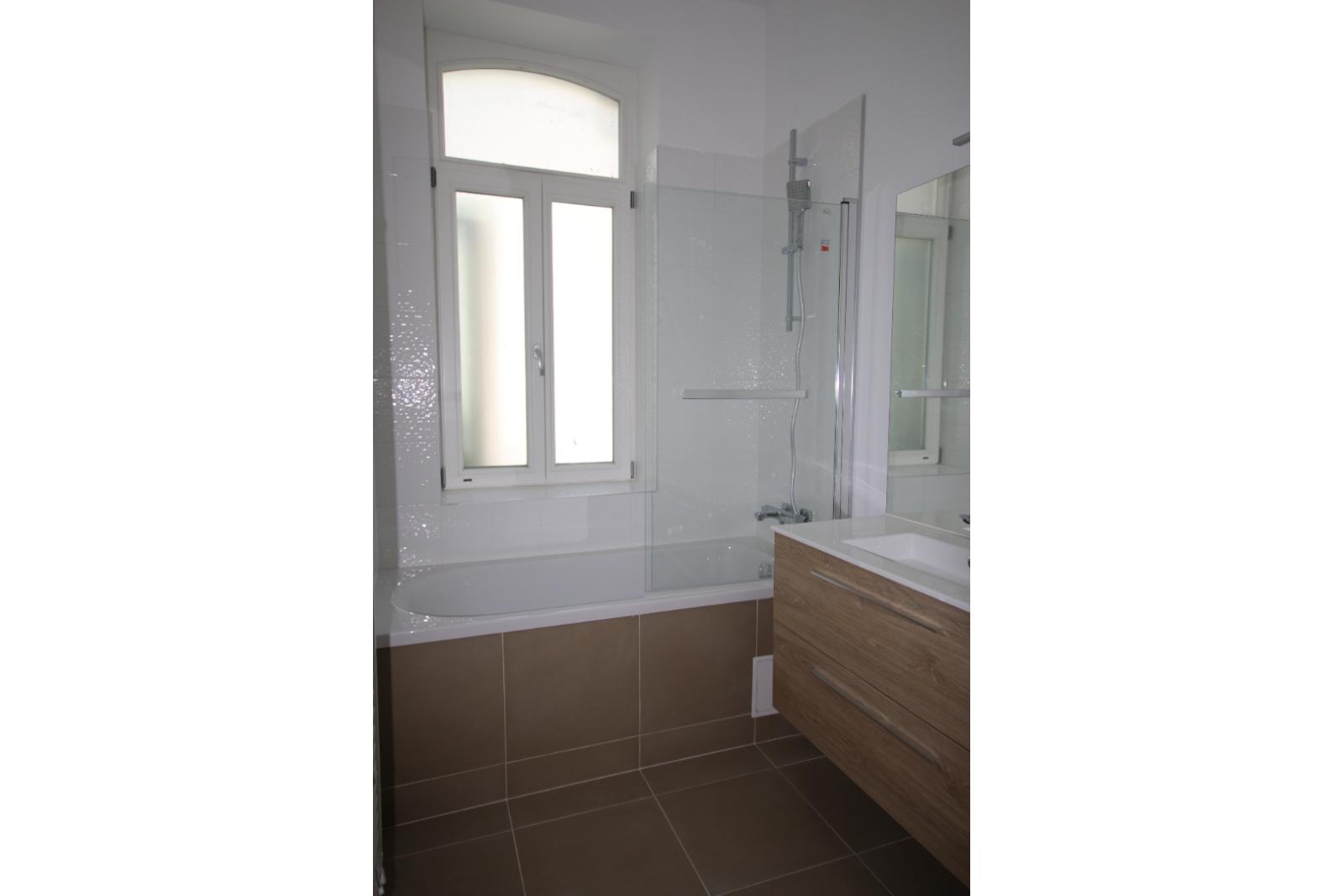 T3 rénové de 81 m² situé au rez-de-chaussée en fond de cour. Il comprend un grand séjour avec cuisine équipée (plaque, hotte, four, lave-vaisselle, micro-ondes, frigo et congélateur) donnant sur un patio, deux chambres avec placards (dont une avec mezzanine et salle d'eau (douche et meuble vasque), une salle de bain (baignoire, meuble double vasque, emplacement lave-linge), WC séparés.