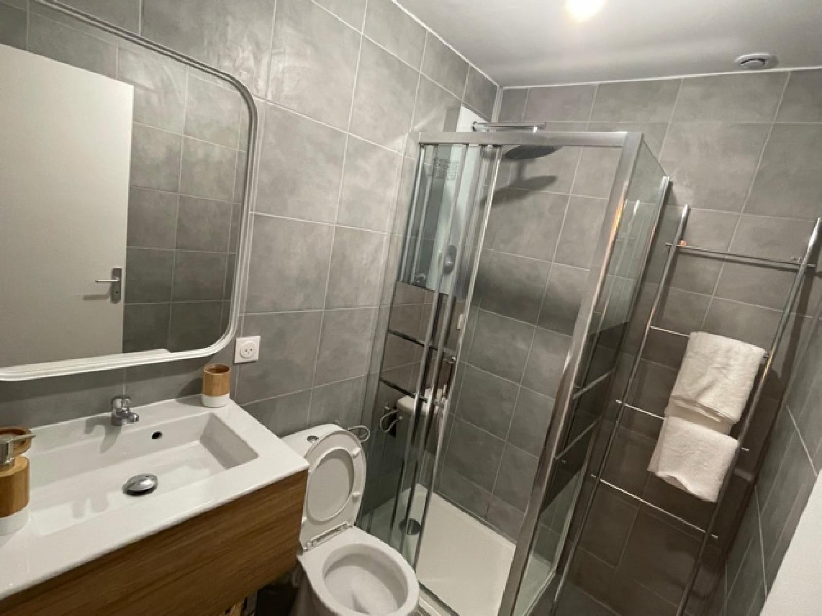 Il comprend également une cuisine équipée séparée (plaques, hotte, frigo et four) ainsi qu'une salle de douche.
