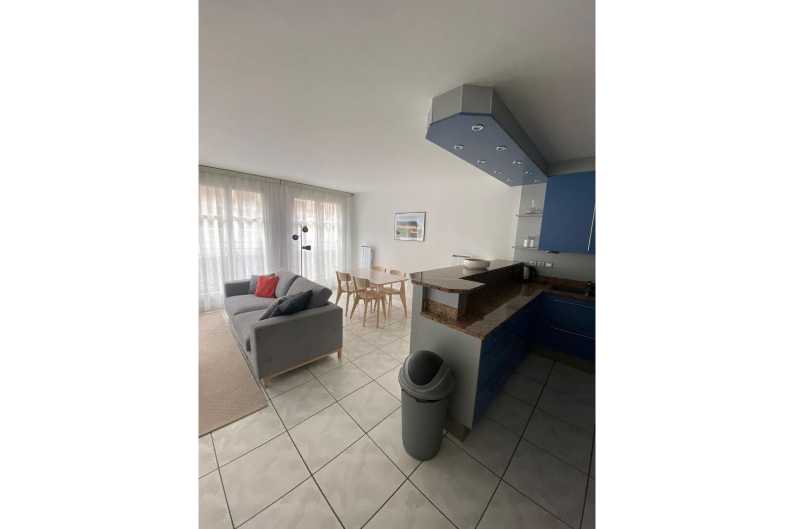 T2 MEUBLE de 75.71 m², situé au premier étage comprenant une entrée, une pièce de vie avec cuisine équipée (plaque, hotte, four, frigo américain, lave vaisselle), une chambre (lit double), un dressing, une salle de bains (douche, double vasque et MAL) et WC séparés.