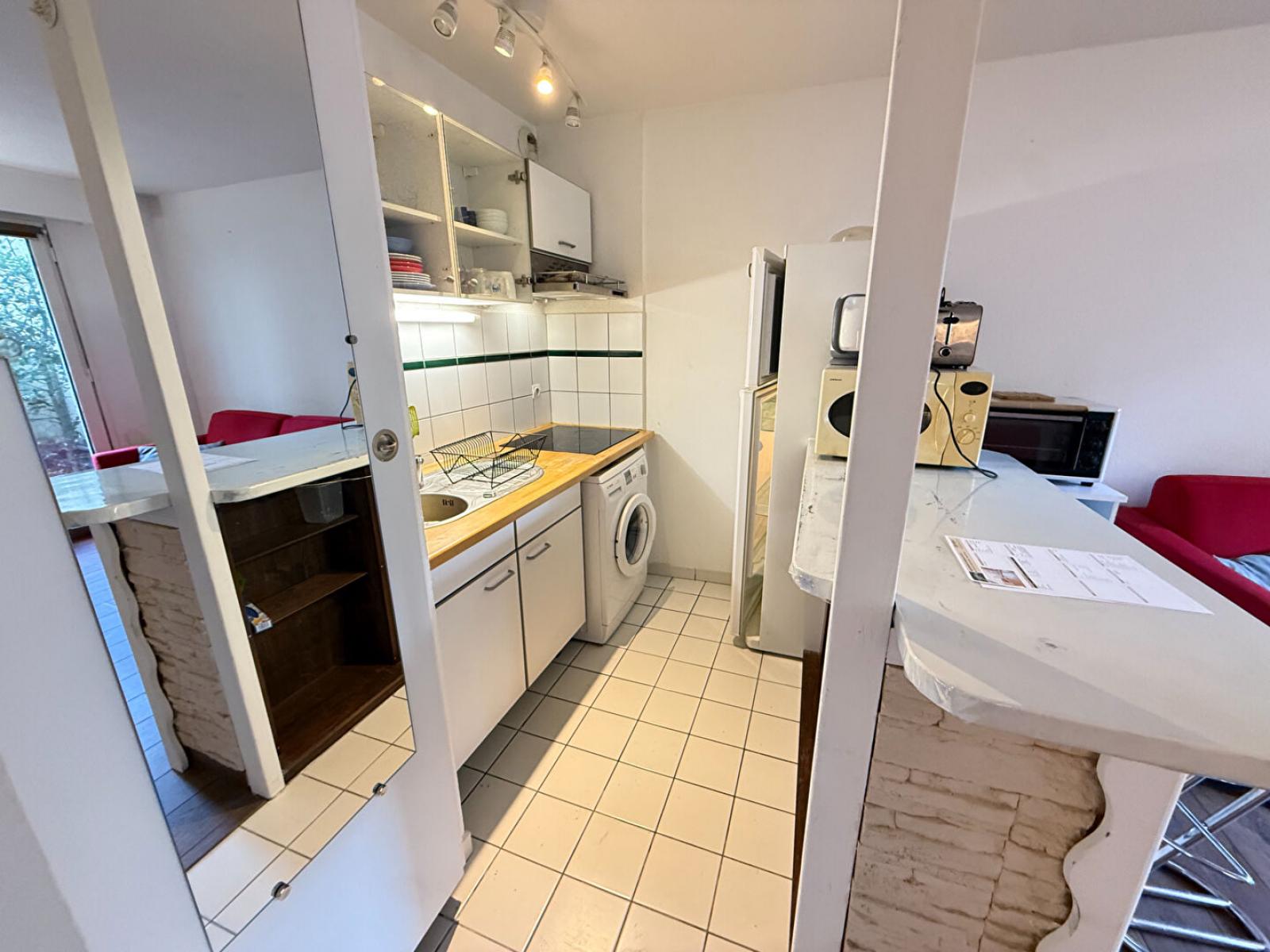 T2 meublé situé rue des Tours, de 42.01 m² comprenant une entrée, une pièce de vie. Le bien se compose également d'une cuisine équipée (plaques de cuisson, machine à laver, micro-onde, évier et rangements haut et bas) une chambre, une salle de bain et WC séparé, une terrasse de 10 m² donnant sur un jardin.