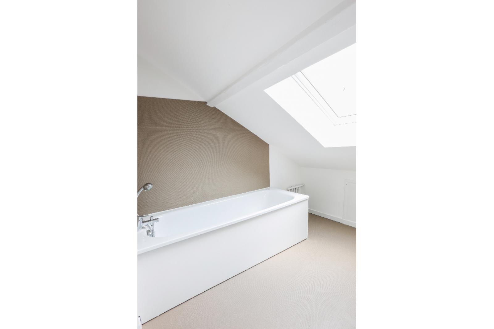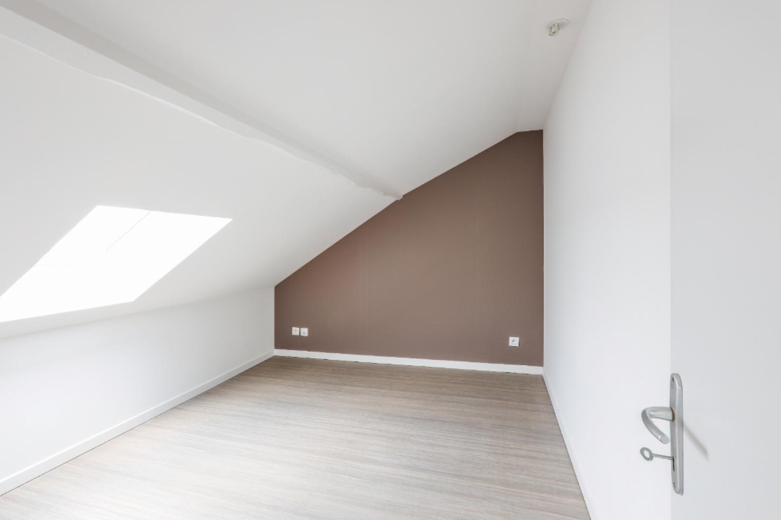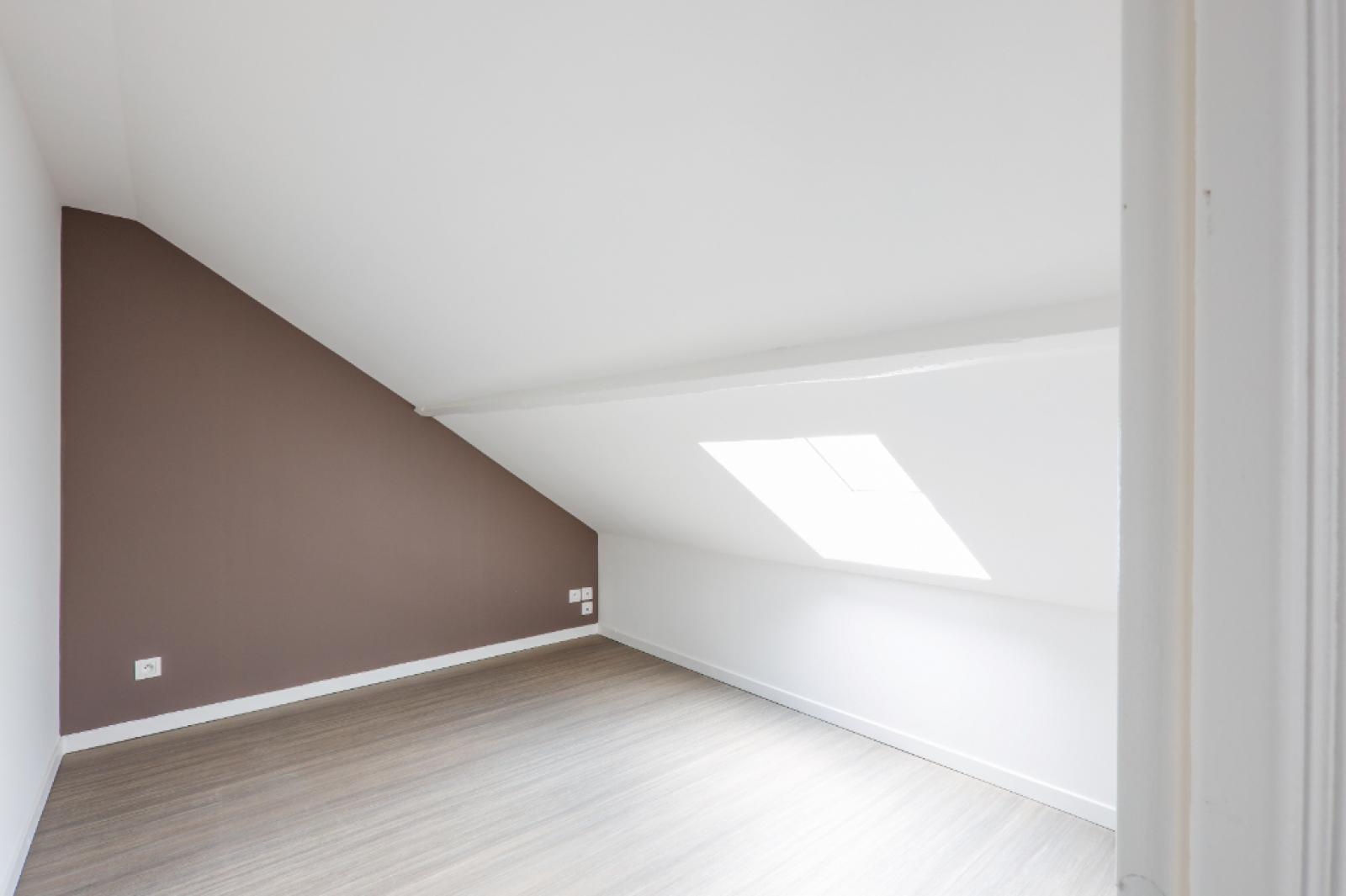 T3 de 54 m² (surface au sol) et de 23 m² (surface habitable) situé au quatrième et dernier étage sans ascenseur. L'appartement comprend un séjour, une cuisine équipée (plaques de cuisson, réfrigérateur et emplacement MAL), deux chambres sous-pente, une salle de bain (baignoire, meuble vasque), WC séparés.