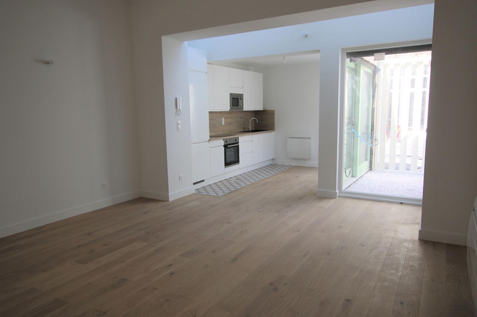 T3 rénové de 81 m² situé au rez-de-chaussée en fond de cour. Il comprend un grand séjour avec cuisine équipée (plaque, hotte, four, lave-vaisselle, micro-ondes, frigo et congélateur) donnant sur un patio, deux chambres avec placards (dont une avec mezzanine et salle d'eau (douche et meuble vasque), une salle de bain (baignoire, meuble double vasque, emplacement lave-linge), WC séparés.