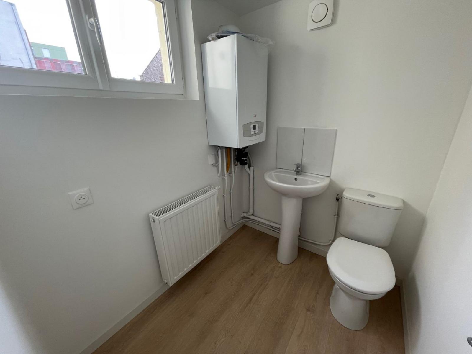 T3 bis en triplex avec une cour privative orientée plein sud, complètement neuf situé au 8 rue de Lannoy à Lille dans le quartier de Fives, à 2 pas du métro. Il se compose au rez de chaussée, d'une entrée parquetée donnant sur une pièce de vie avec coin cuisine aménagée et équipée (plaques, hotte, four, rangements) ainsi que des WC séparés. Au premier étage se trouvent une chambre et la salle de bain avec baignoire, meuble vasque, WC et branchement Mal). Le deuxième étage se compose d'une chambre et d'un bureau/dressing/chambre de bébé. Ce bien comporte également une dépendance fermée d'environ 5 m2.