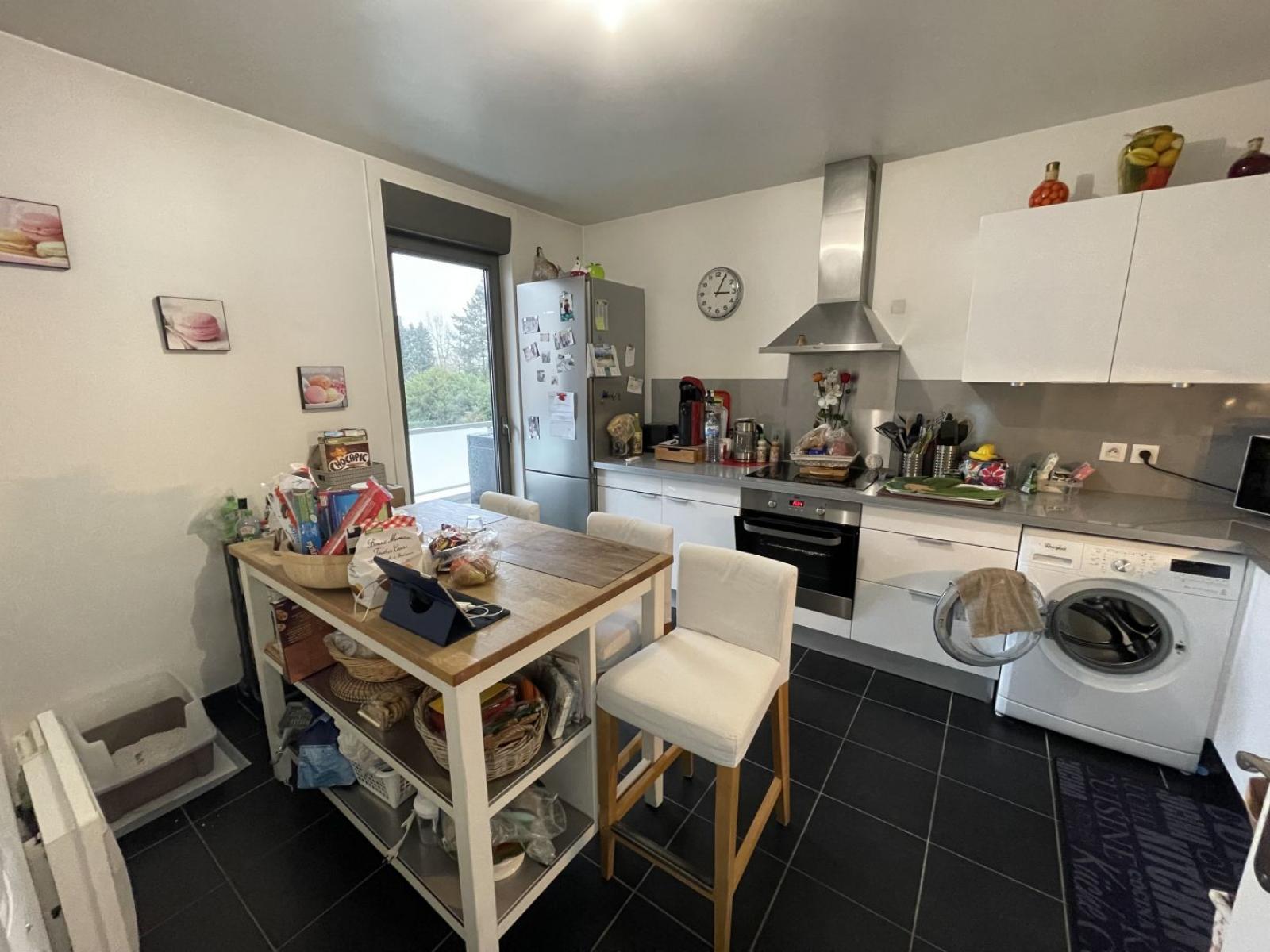 Une grande pièce de vie donnant sur une terrasse, et une cuisine séparée avec plaques, four, hotte.
