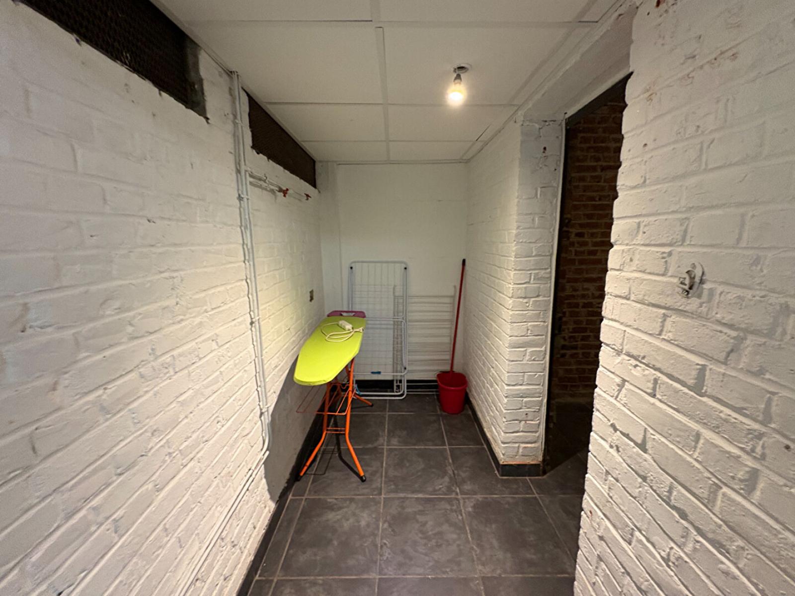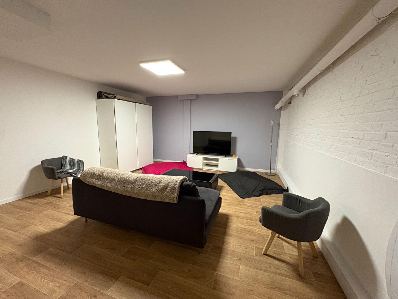 En souplex, un grand salon avec TV et canapé, un espace salle de sport et un espace buanderie.