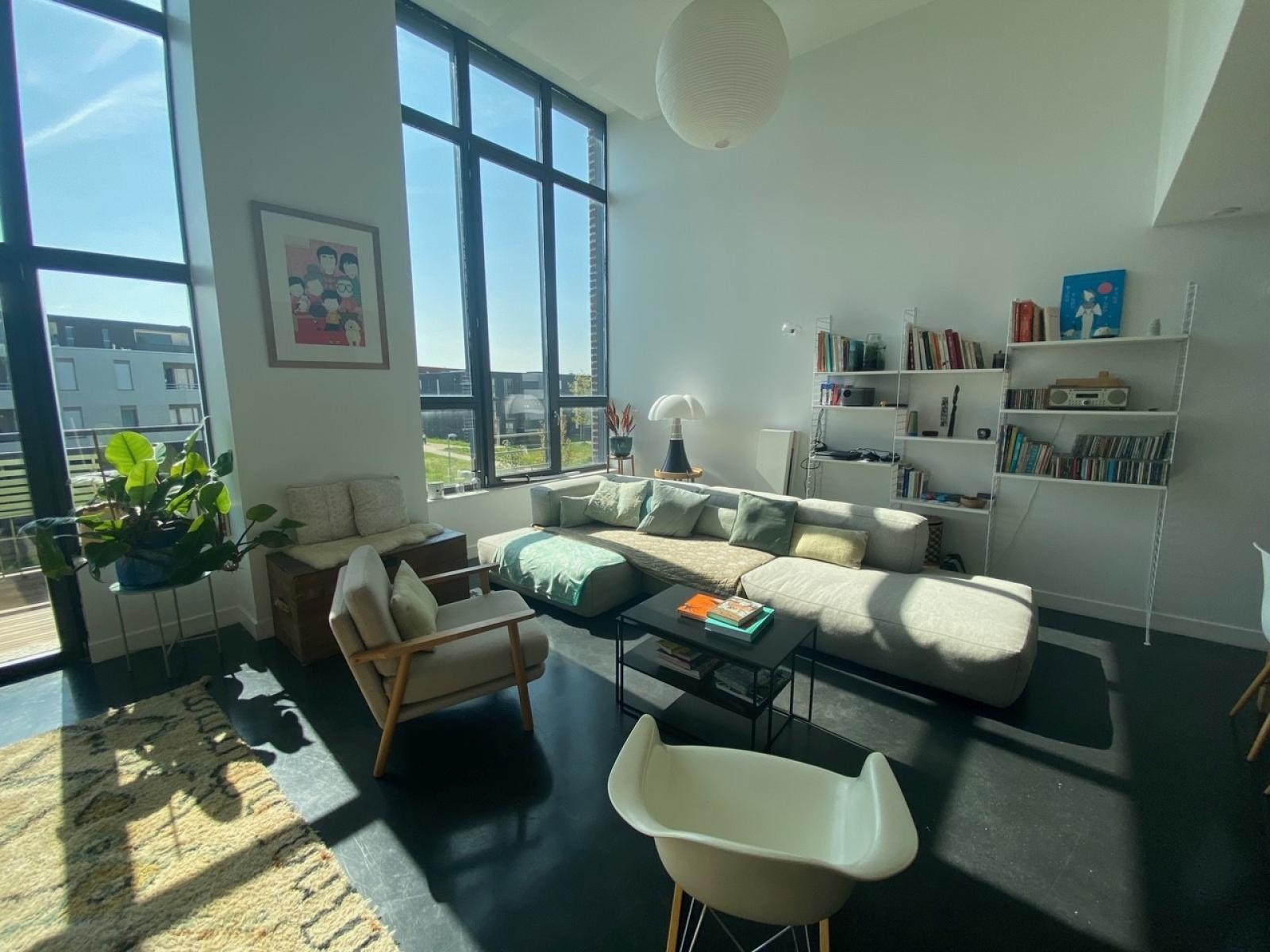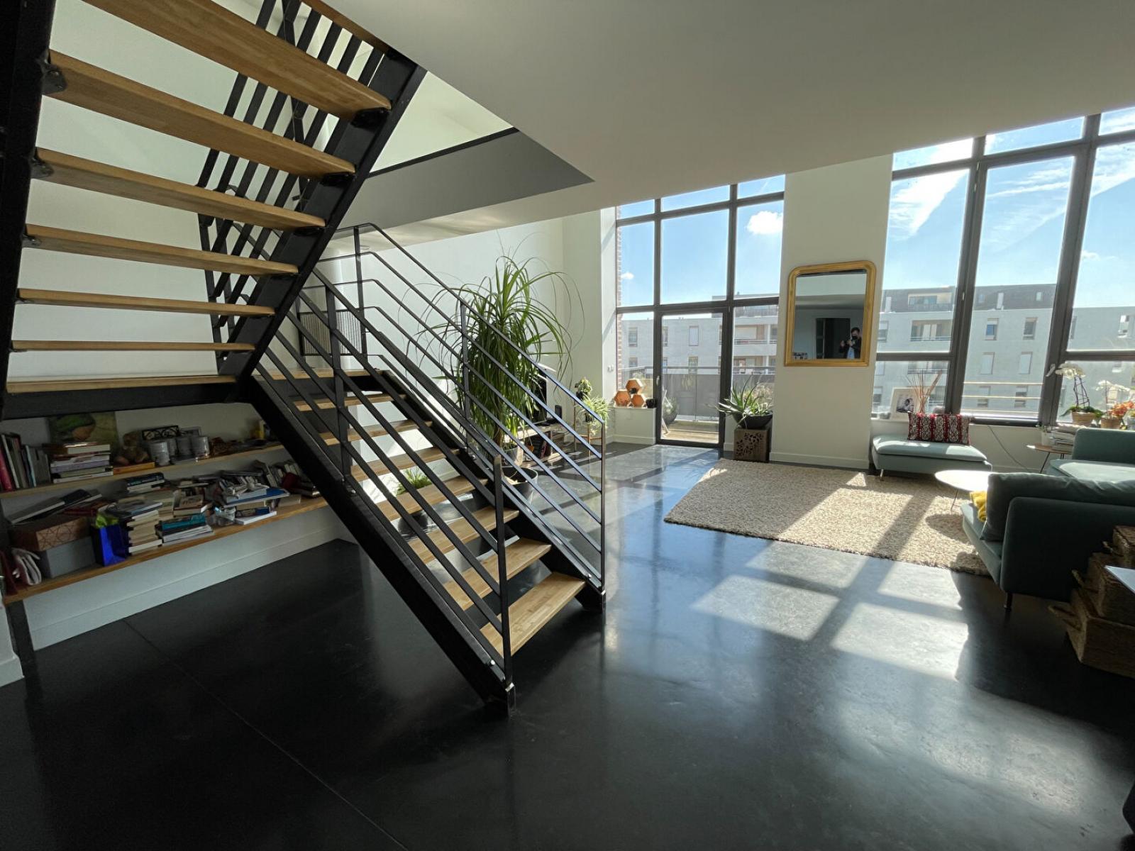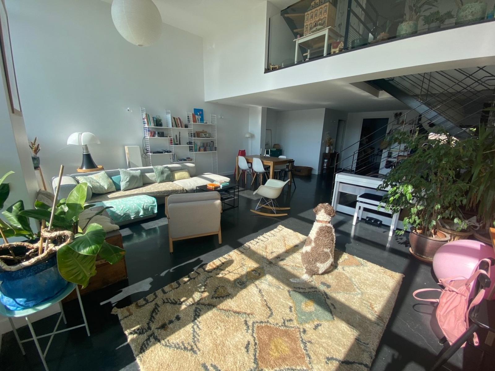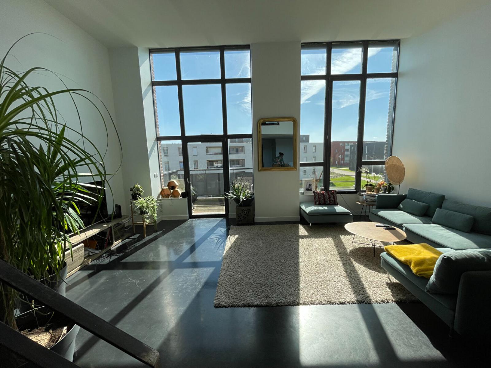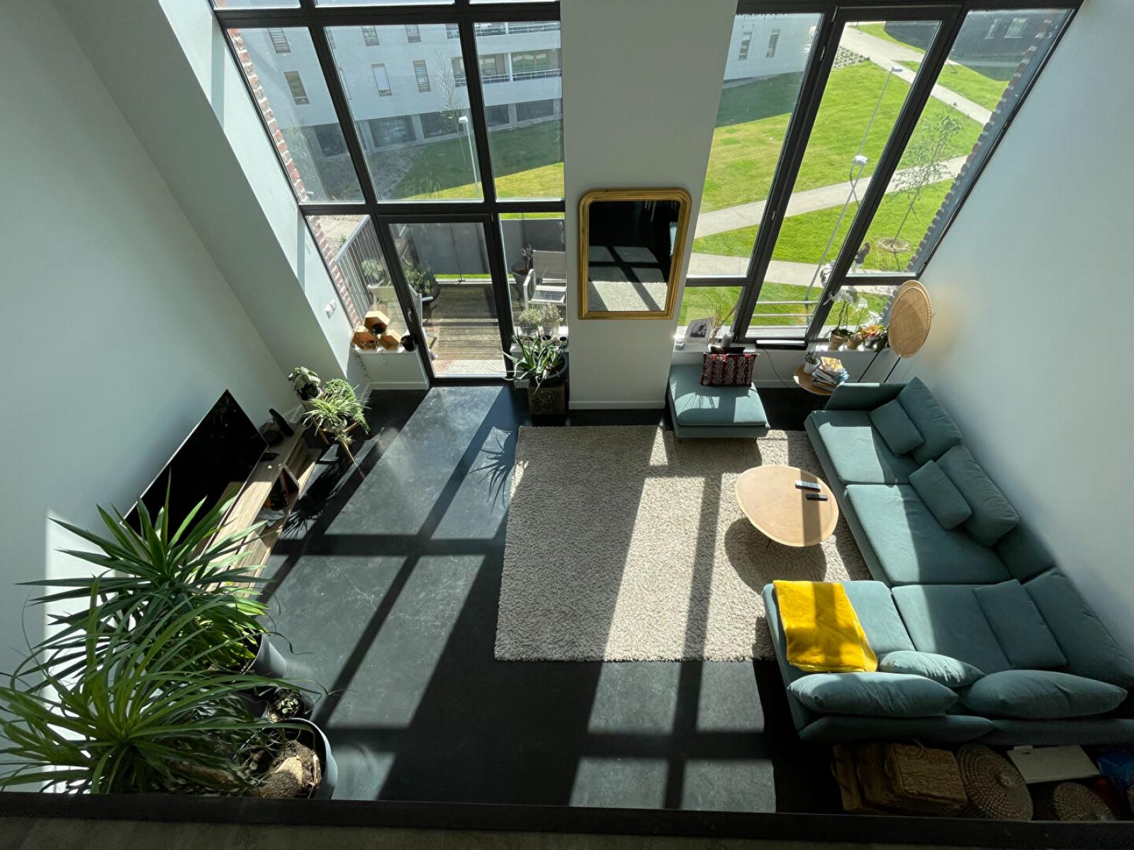Loft T5 MEUBLÉ de 125 m² situé au 2ème étage avec ascenseur. Il comprend au 1er niveau une entrée avec placard, un séjour de 57 m² (canapé, table basse, table à manger et chaises) donnant sur une terrasse bien exposée, une cuisine équipée ouverte (plaque, hotte, four, lave-vaisselle), un cellier (lave-linge), une chambre avec placard, une salle de douche et des WC.