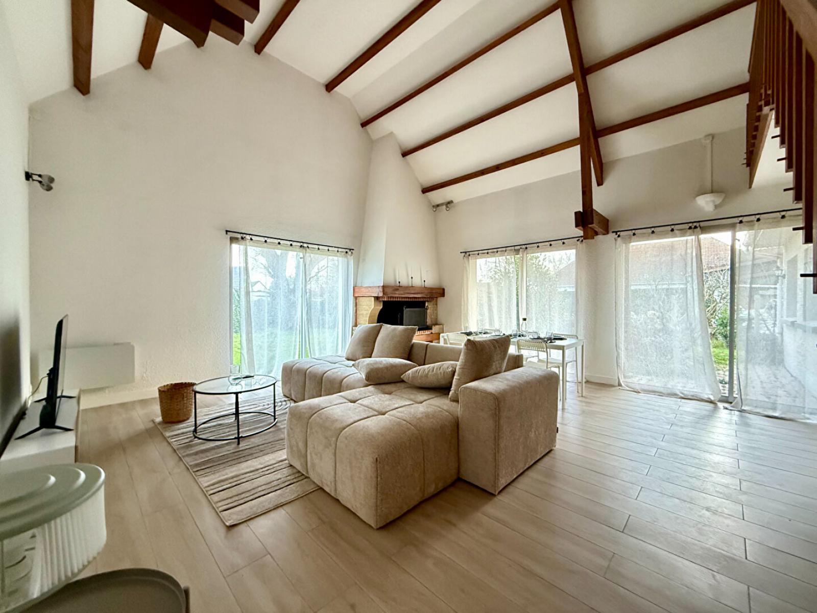 Grande pièce de vie avec hauteur cathédrale, cheminée et large apport de lumière naturelle