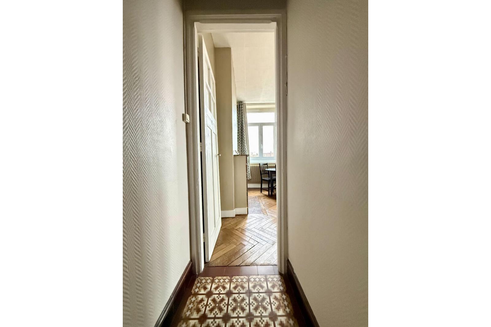 Situé au cinquième et dernier étage sans ascenseur, cet appartement de type 2 développe une surface de 39 m² et séduit par sa disposition optimisée et son charme authentique. L'entrée avec rangements dessert un couloir menant à une chambre de bonne taille, au calme, ainsi qu'à une pièce de vie particulièrement lumineuse grâce à deux fenêtres. Celle-ci offre une vue dégagée sur les toits et conserve tout le cachet de l'ancien avec son parquet d'époque et sa cheminée décorative en marbre.