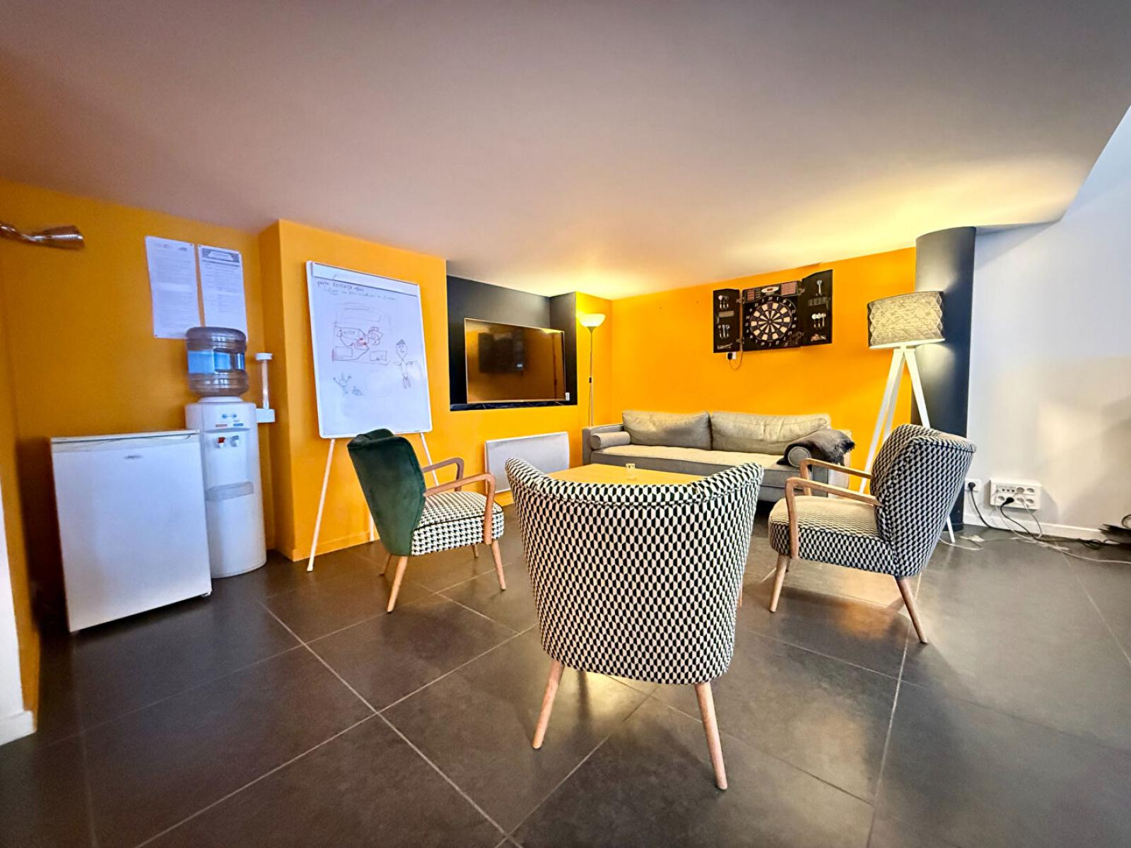 Dès l'entrée, le bien séduit par une très grande pièce principale aménagée en open space, bénéficiant de superbes volumes, d'une belle hauteur sous plafond et de trois grandes fenêtres apportant une luminosité naturelle exceptionnelle. Cet espace accueille également une cuisine ouverte aménagée et équipée, ainsi qu'un coin détente, créant une atmosphère conviviale et moderne, idéale pour le travail collaboratif.
