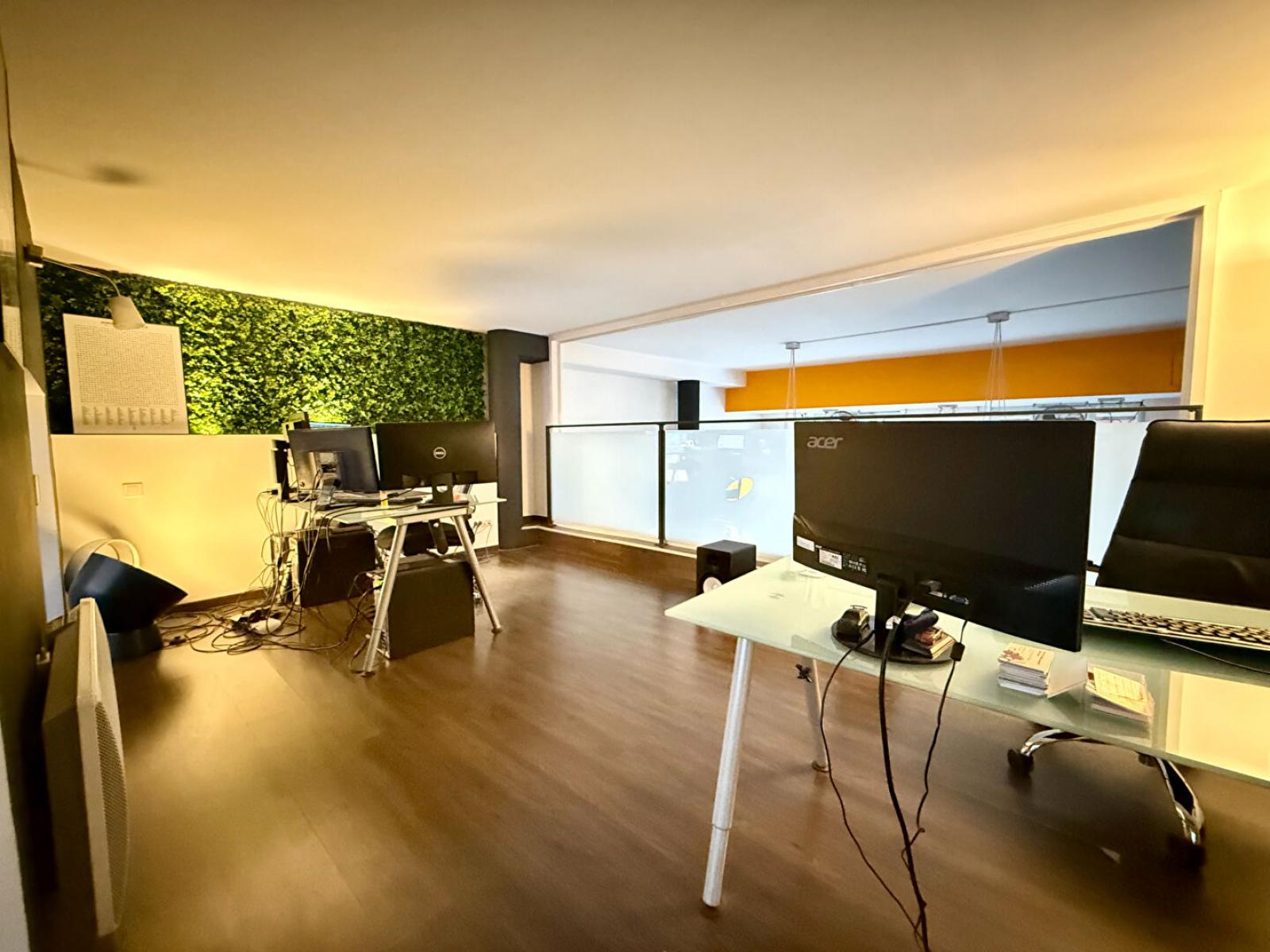 Un escalier mène à une mezzanine qui dessert deux bureaux, offrant un espace plus calme et structuré. A l'arrière, on découvre une grande pièce comprenant deux bureaux de direction, ainsi qu'un salon / espace détente, parfait pour les temps de pause ou les échanges informels. Un WC est présent à chaque niveau, garantissant un réel confort d'utilisation.